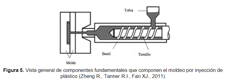 El moldeo por inyección de plástico interactúa principalmente con los siguientes objetos que son los que se tienen que cuidar en un mantenimiento: unidad de inyección, tornillo, nariz y molde, como se puede observar en la figura 5. Es en estos componentes donde se pueden integrar las tecnologías del IIoT para medir las variables que permitan monitorear y controlar el proceso.