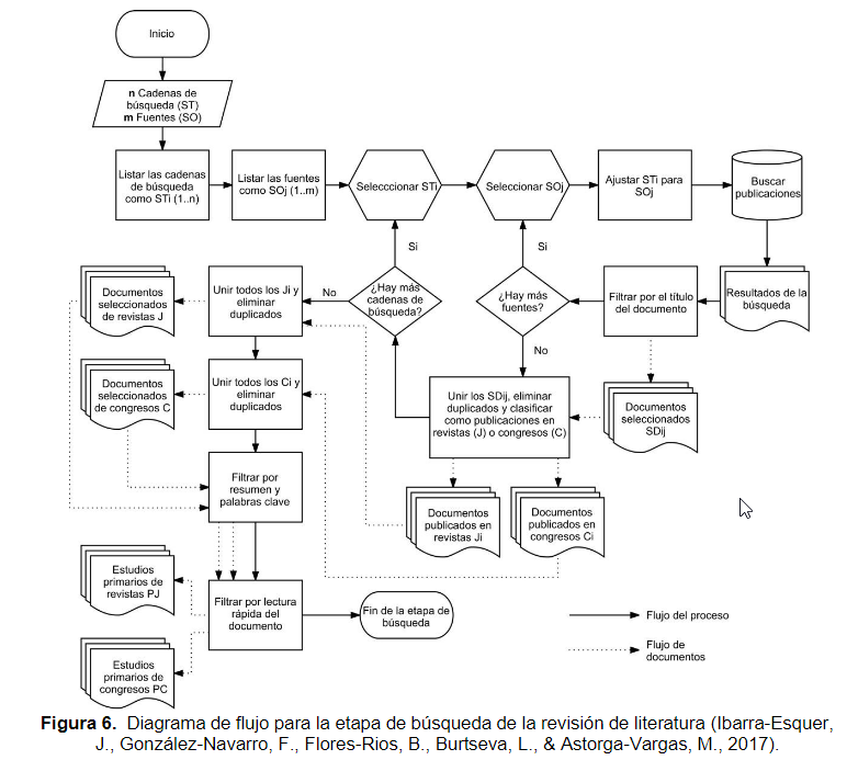 Para la fase de búsqueda y selección de documentos se siguieron los pasos mostrados en el diagrama de la figura 6 (Ibarra-Esquer, J., González-Navarro, F., Flores-Rios, B., Burtseva, L., & Astorga-Vargas, M., 2017), donde: