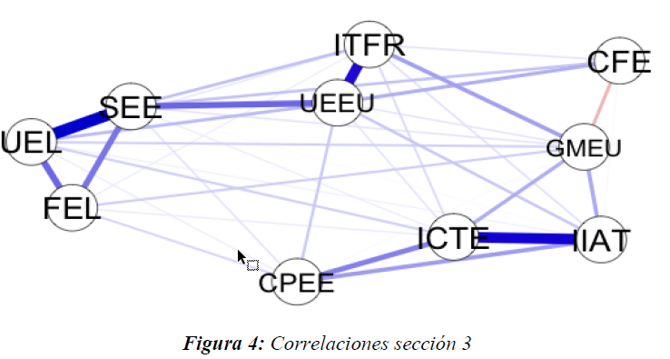 Por último, en la Figura 6 se unieron las variables de la sección 2 y 3. En esta Figura 6 se marcó con un punto azul las variables de la sección 3 para diferenciarlas de la sección 2. Las correlaciones que llaman la atención es la de la variable OTA (organización de tiempos y actividades) que tiene correlación con varias variables de la sección 3 (UEL, SEE, UEEU e ITFR). CFE (preferencia por continuar de manera semipresencial en el futuro) tiene correlación negativa con la actual RDSC (reproducción de la dinámica de clases), y positiva con las variables EPED (experiencia previa en educación a distancia) e ICT (incremento en la carga de trabajo). GMEU tiene correlación con TAEE, PU, PPM, RDSC de la sección 2.