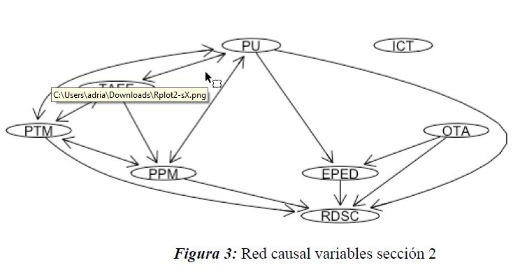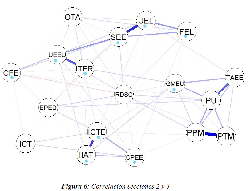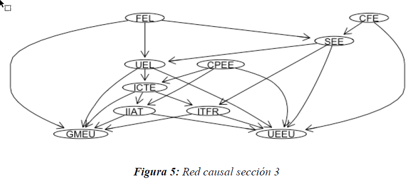 La Figura 7 muestra la red causal de las variables de las dos secciones, aquí podemos observar la interacción de direccionalidad entre secciones en, por ejemplo, la variable OTA que al parecer tiene influencia sobre ITFR y UEEU. También GMEU sobre PU y PPM, RDSC tiene influencia sobre GMEU, SEE y UEEU, y EPED sobre UEEU e ICTE.