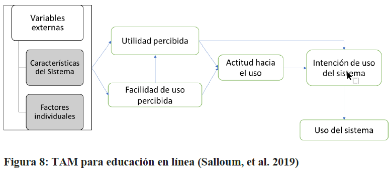 El conocido modelo de aceptación de la tecnología TAM (por sus siglas en inglés, Technolgy Acceptance Model) propuesto por Davis (1989), establece que lo que lleva a la utilización de un sistema tecnológico está determinado por ciertas variables externas que tienen un impacto tanto en la precepción de utilidad como en la percepción de la facilidad de uso por parte de los posibles usuarios. Salloum, et al. (2019), estudiaron los factores externos directamente relacionados con la tecnología para la educación en línea mediante una revisión literaria. De acuerdo con Salloum et al. (2019) las variables externas del modelo de Davis (1989) se pueden dividir en características del sistema y factores individuales, en la Figura 8 se muestra el TAM adaptado para educación en línea, en el que básicamente se distinguen las variables externas dividiéndolas en características del sistema y factores individuales.