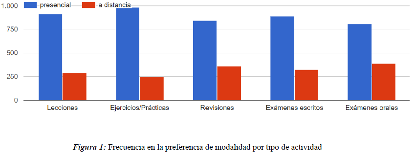 Las competencias digitales de los encuestados han mejorado principalmente [P61] en la descarga, organización e intercambio de contenido digital (55.1%), en el uso de herramientas para la comunicación digital (51.8%), y en el procesamiento y visualización de información (45%). De las diferentes prácticas relacionadas con actividades educativas, lecciones, ejercicios/prácticas, revisiones, exámenes escritos, y exámenes orales, se les preguntó si es mejor hacerlo de manera presencial o virtual [P67]. Las respuestas se pueden observar en el gráfico de la Figura 1, en donde podemos ver que la preferencia es mucho mayor para realizar todas estas actividades de manera presencial.