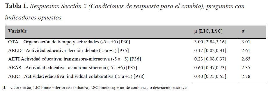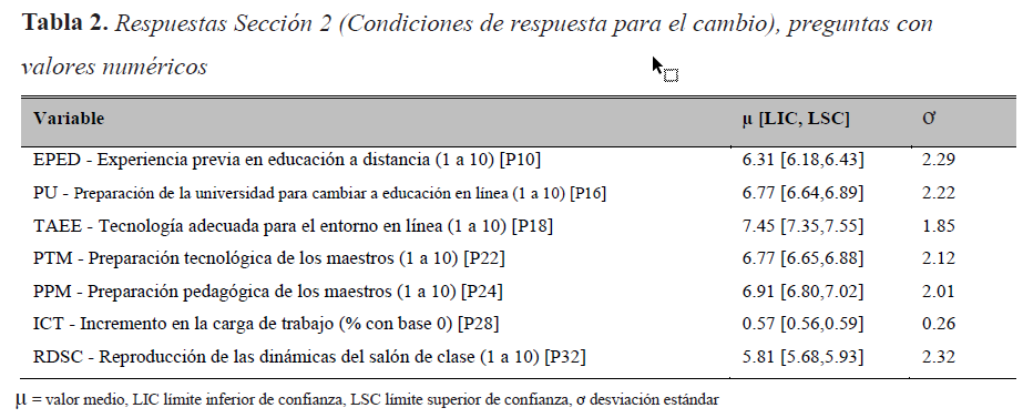 En la siguiente Tabla 2 podemos observar las medidas centrales de resultados de la sección 2, para las respuestas con escala del 1 al 10 (excepto la variable ICT, incremento en la carga de trabajo, que maneja porcentajes del 0% con incrementos del 10%). En la primera columna están las variables relacionada a las preguntas, en la segunda columna es la media y entre paréntesis cuadrados el límite inferior y superior con 95% de confianza, la tercera columna muestra la desviación estándar.