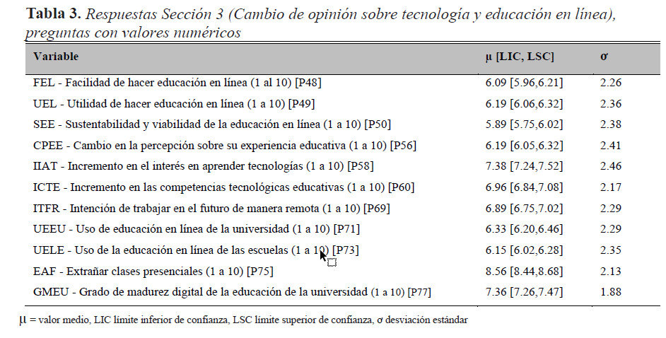 La siguiente Tabla 3, presenta los resultados de la tercera sección del cuestionario, dirigida a entender el cambio de opinión en ciertos temas. Sobresale la alta calificación que se le da a extrañar las aulas físicas o clases presenciales (EAF, 8.56). Podemos ver también que los encuestados han incrementado sus competencias tecnológicas educativas (IIAT, 6.96) y su interés por estas tecnologías (ICTE, 7.38). Finalmente, también puntean alto el grado de madurez digital de su universidad (GMEU, 7.36).