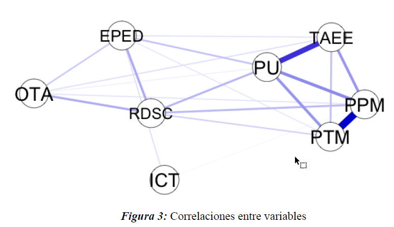 Los coeficientes de correlación Pearson entre variables más significativas encontradas (arriba de 0.50) son: PU con TAEE (.68), PTPM (.65) y PPM (.67) lo que significa que la preparación de la universidad para el cambio está relacionada con el uso de una tecnología adecuada para el entorno en línea, y la preparación pedagógica y tecnológica de los maestros. A su vez TAEE está relacionado con PTM (.59), PPM (.62) y la percepción del grado de madurez de la universidad, GMEU (.56). La percepción del grado de madurez de la universidad tiene a su vez correlación con PU (.58), TAEE (.56), PTM (.52) y PPM (.55). Asimismo, PTM y PPM tienen una fuerte correlación entre ellos (.78). La facilidad de hacer educación en línea (FEL) está relacionado con su utilidad (UEL, .56) y en el mismo grado con su sustentabilidad y viabilidad (SEE, .56). UELE, la percepción de la utilidad de la educación en línea de las escuelas, está fuertemente correlacionado con SEE (.73). UELE también tiene correlación con UEEU (.55) la utilidad de la educación en línea para la universidad. ICTE y IIAT tiene una correlación de .60, lo que significa que el incremento en el interés por aprender tecnologías educativas se relaciona con el aprendizaje que se ha tenido de dichas tecnologías. Por último, ITFR, la intención de trabajar en el futuro de manera remota presenta correlación con SEE (.51), UEEU (.62) y UELE (.58).