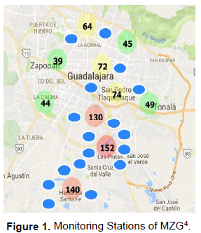 The Metropolitan Zone of Guadalajara (MZG) is formed by eight municipalities of the Jalisco state as Guadalajara, Zapopan, San Pedro Tlaquepaque, Tlajomulco de Zuñiga, Tonalá, El Salto, Ixtlahuacán de Los Membrillos, and Juanacatlán [19]. With a total of territorial superficies 2,384.66 Km2 and a total population of 4,796,603 estimations of the 2015 year from INEGI. MZG continuously registers periods of unhealthy levels of air quality [20]. In the MZG exist eight static monitoring stations located in Las Águilas, Atemajac, Centro, Loma Dorada, Miravalle, Oblatos, Tlaquepaque, and Vallarta. Integrating the Automatic Network of Atmospheric Monitoring of the MZG of the state government of Jalisco. These monitoring stations determine the zones of greatest pollution with measurements every 10 minutes 24 hours a day, and 365 days a year [21] with static monitoring stations. But the MZG has a constant increase in pollutants, therefore, predominant the identification of zones with a greater increase in pollution. By identifying the causes of pollution more accurately better actions could be taken to reduce the agents of contamination consequently the Quality of Life.
