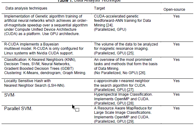 In principle, Data Mining is a process of pattern discovery [22]. This premise was raised in this way because of its analogy with mining since a series of stages are carried out to achieve the economic exploitation of minerals such as extraction, smelting, processing, refinement, and transport. Mainly, the handling of large volumes of geological material to be revised. This need also appears in data analysis, where filtering or cleaning, sorting, and presentation of the data becomes more vital, and is better known as Extraction, Transform, and Load (ETL). The IoT boom has accelerated research on the analysis of high volumes of information caused by the high speed of information capture by the monitoring sensors, a factor that has influenced the appearance of the term Big Data [23]. Different studies have been proposed to solve problems concerning these topics, in Table 1. Data Analysis Techniques are presented. Several of the techniques are parallelized and implemented by GPU, the GPU technology is required to speed up the operation of applications, and it is an open-source architecture. The parallel SVM algorithm was recommended in this model as the analysis technique. It reduces the training time significantly compared with the Sequential Minimal Optimization (SMO) algorithm while maintaining a high level of accuracy in classifications [29]. Godoy [30] presented a literature review of scientific journals published in the years 2010 and 2011, with the aim of identifying the main machine learning techniques utilized for text mining. The main technique used by the studied author was SVM with 22.72% of incidents. SVM is a method that achieves high degrees of correct classification in various types of applications.