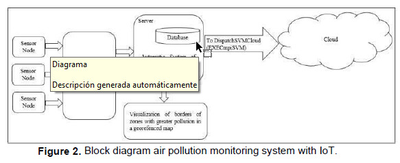 As a result of the analysis of the problem, a model is proposed to implement an automated system that carries out the activities of data analysis through SVM to identify the areas that require the placement of new sensors for better territorial monitoring. The model is described by the architectural, behavioral, and deployment view through UML class diagrams and activity diagrams. Figure 2 Block diagram air pollution monitoring system with IoT shows the deployment view of the automated system of air pollution monitoring using the IoT. In conjunction with the detection of data in the current stations, integrating an open architecture with heterogeneous devices constitutes a modular system. In the monitoring stations, there will be a network of sensors will be integrated with a microcontroller under an embedded software platform, the sensors capture the quality of the air produced in real- time, the data in continuous sensing are obtained by the microcontroller and sent to the server where there would be a database that would store the collected data. In this UML model, the first action is the control of data cleaning, then the data analysis with vector machines and the derivation of processes in parallel to the working modes of the cloud; finally, the UML model returns the best kernel function (radial basis or polynomial function).