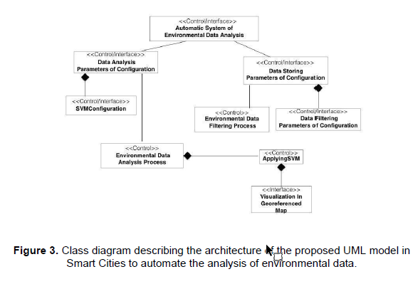 To automate the process of data analysis of the environment, it was observed that a data analysis algorithm for Smart Cities metrics operates as a domain coupled to an information context or workspace and processes in the form of elements of control, which are: configuration for storage, filtering (or cleaning) and form of data extraction, the configuration of SVM environment variables for their cloud parallelization and visualization. See figure 3, the class diagram that describes the architecture of the proposed model to Smart Cities automated system for analysis of environmental data.