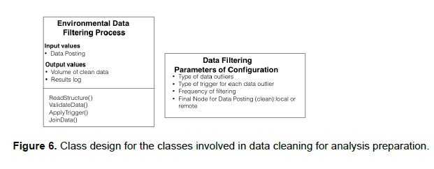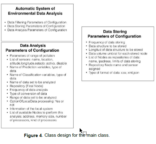 B) Updating the parameters for storage named Data Storing. Parameters of Configuration associated with the filtering and storage configuration classes. It relates to the filtering process to trigger it according to the value of the cleaning frequency parameter. The internal design for the Classes Automatic System of Environmental Data Analysis, Data Analysis Parameters of Configuration and Data Storing Parameters of Configuration are shown in figure 4 Class design for the main class, the design of the classes Environmental Data Analysis Process, SVMConfiguration, ApplyingSVM, and Visualization in Georeferenced Map. In figure 5 Class design for classes involved in scientific data analysis, figure 6 Class design for the classes involved in data cleaning for analysis prepared for the Environmental Data Classes Filtering Process and Data Filtering Parameters of Configuration.