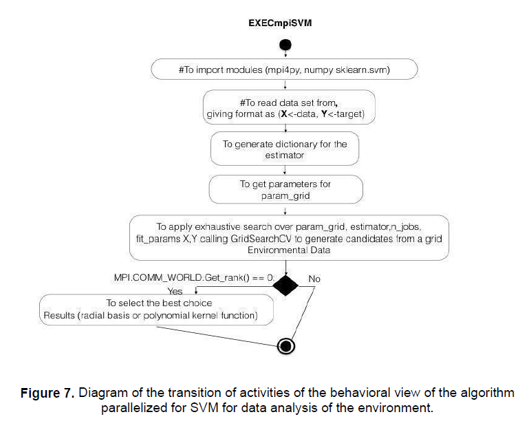 In the behavioral view, it is indispensable to show the algorithm EXECmpiSVM triggered by the ToDispatchSVMCloud method belonging to the ApplyingSVM class. figure 7 shows the Diagram of the transition of activities of the behavioral view of the algorithm parallelized for SVM for data analysis of the environment.