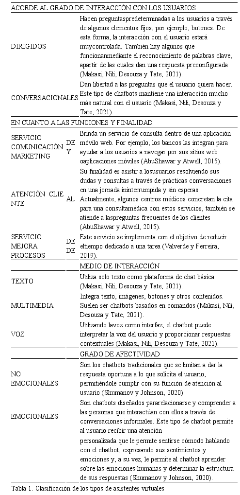Actualmente existen diferentes características que poseen los asistentes virtuales que se pueden implementar para facilitar las funciones y procesos. La Tabla 1 muestra la clasificación de los diversos tipos de asistentes virtuales encontrados en la revisión de la literatura.