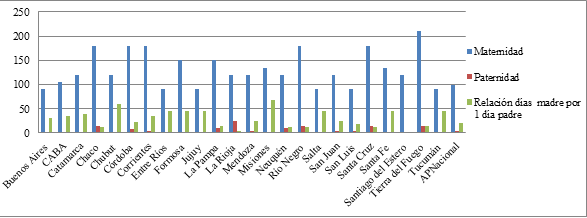 Las políticas en materia de licencias por nacimiento también auguran desafíos sustantivos, debido a diferencias existentes en los regímenes laborales (por sector productivo y dependencia territorial) y la segmentación del mercado laboral (entre empleo registrado y no registrado). Adicionalmente, los estudios existentes permiten advertir que en esta materia también persiste una visión maternalista, evidenciada en la media de la relación de días de licencia por maternidad en relación con la de paternidad, que es de 30,3 días (es decir, las madres cuentan con 30,3 días de licencia por cada día de licencia con la que cuentan los padres).