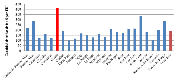 El tamaño de los establecimientos, lo que resulta relevante para evaluar la capacidad de gestión del Plan Nacional de Educación Inicial es marcadamente variable por provincia, con un extremo en la provincia del Chaco con establecimientos que atienden en promedio a 400 niños y provincias donde cada establecimiento atiende a no más de 100.[9]