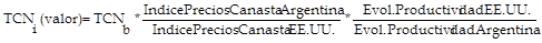 En este sentido, por un lado, el peso argentino pierde capacidad de representar valor en la proporción en la que la evolución de su productividad se aleja de la de Estados Unidos, en tanto el trabajo desplegado en Argentina, en promedio, no se está realizando en las condiciones medias (o, alternativamente, se realiza aún más alejado de ellas). Lo mismo ocurre en la medida en que el peso pierda poder adquisitivo de una canasta de valores de uso de composición constante a mayor velocidad que el dólar. De esta forma, la evolución de la productividad relativa y de los precios relativos entre ambos países constituyen las dos afectaciones a realizarle al tipo de cambio nominal base (esto es, el que se correspondería con el nivel de paridad de representar valor de cada una de las moneda), de modo de obtener por resultado el tipo de cambio nominal que en cada momento se correspondería con dicho nivel. En la siguiente expresión identificamos al primero como TCNb y al segundo TCNi (valor), donde el subíndice i indica el correspondiente año: