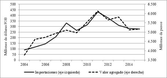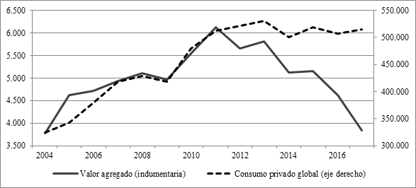 A pesar de que la participación de la indumentaria importada en el consumo aparente se ha mantenido desde 2007 por encima de los niveles de los noventa, solo en 2016 este indicador pasó a ser una preocupación hecha pública por los representantes del empresariado del sector. De hecho, las importaciones no surgieron como una preocupación en las entrevistas con empresarios realizadas por este investigador entre 2007 y 2016. Ello indica desde ya que las dificultades impuestas por la vestimenta importada se hacen notar en la medida en que el consumo disminuye y la competencia se incrementa, hecho que de por sí destaca la importancia del nivel de consumo sobre la producción local.