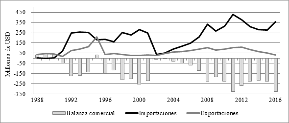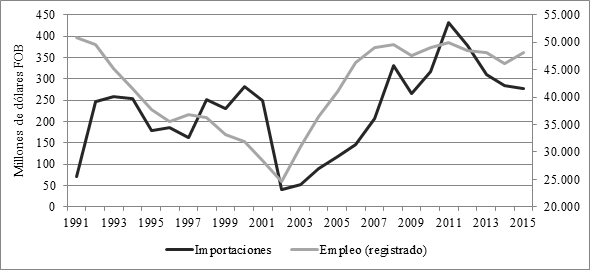 El gráfico muestra que la balanza comercial del sector es estructuralmente deficitaria desde que las importaciones aumentaron exponencialmente en 1990. Al respecto se destacan dos períodos excepcionales: 1994-1997, período en el que se combinaron medidas de protección arancelaria de la administración menemista y caída del consumo interno (Efecto Tequila), y 2002-2004, con el cierre virtual de la importación por la fuerte devaluación entre enero y junio de 2002. El déficit se aceleró desde entonces a medida que el consumo interno se recuperó y los costos locales se acercaron a los niveles de los noventa, manteniéndose claramente deficitaria a un nivel similar al del pico del año 2000. En los últimos dos años, con el cambio de gobierno (diciembre de 2015) se nota un claro incremento en el déficit, motivado en especial por un drástico salto en las importaciones resultado del abandono de la administración del comercio, que desde octubre de 2008 había adoptado diversas formas (Valores Criterio en la Aduana, Licencias No Automáticas, y Declaraciones Juradas Anticipadas de Importación).