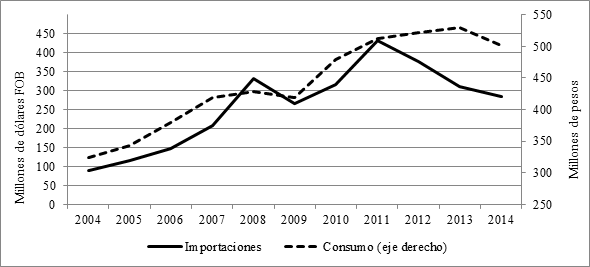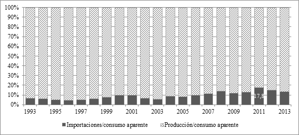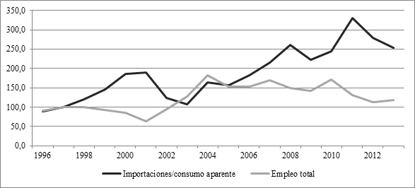 Como se ha dicho, según surge de las entrevistas realizadas y del análisis de declaraciones hechas por empresarios del sector a los medios, existe una fuerte tendencia a vincular directamente las importaciones con la caída del empleo formal en el sector, en particular durante los noventa. La referencia es acompañada por algunas menciones a la caída del consumo interno, aunque este último suele recibir menor atención. Sin embargo, el primer dato que sorprende a los analistas es la muy baja participación de las importaciones en el consumo aparente.