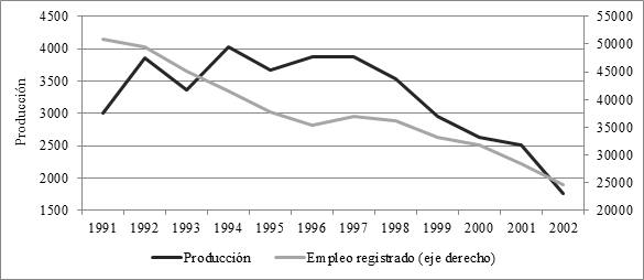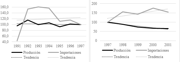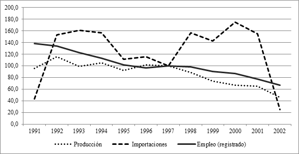 De estos datos surgen dos cruces de variables que resultan especialmente reveladores: la relación entre importaciones y producción, y la que se da entre producción y empleo. En cuanto a la primera, la relación es, en efecto, inversamente proporcional, lo que se ve con mayor claridad después de 1997.