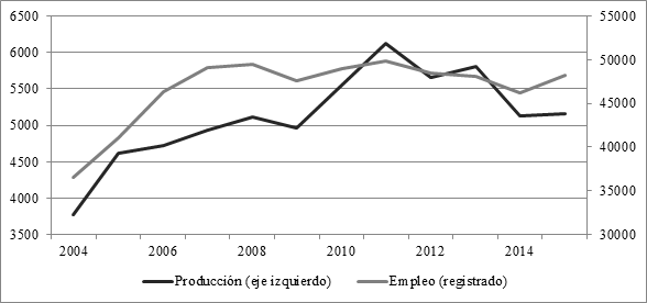 Considerando este dato, no es difícil arriesgar que la idea de que más importaciones implican destrucción de empleos es un tanto simplista. De hecho, la Fundación Pro-Tejer, vinculada a la principal empresa textil del país, exagera este dato para justificar su permanente exigencia de administración del comercio al Ejecutivo, asegurando que la mitad de la ropa vendida en el país es importada.[9] Si bien todo analista esperaría encontrar una relación inversamente proporcional, la relación entre ambas variables es muy compleja, y su evolución está atravesada por otras variables. El siguiente gráfico ilustra con claridad que, en años con niveles similares de importación, el empleo y la producción local pueden presentar variaciones muy marcadas.
