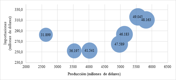 Al cruzar la producción con las importaciones, no existe una relación tan directa ni mucho menos una relación inversamente proporcional.
