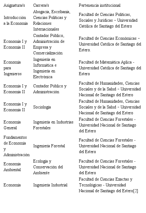 Se escogieron las dos Universidades más grandes, prestigiosas y antiguas de la Provincia: Universidad Nacional de Santiago del Estero (UNSE) y Universidad Católica de Santiago del Estero (UCSE)[1]. La primera cuenta con cinco facultades: Humanidades, Ciencias Sociales y de la Salud; Medicina; Agronomía; Forestales y Exactas y Tecnológicas. Mientras que la segunda está conformada por cuatro: Ciencias Políticas, Sociales y Jurídicas; Matemática Aplicada; Ciencias Económicas y Ciencias de la Educación. Luego de un examen exhaustivo de los planes de estudio de todas las carreras pertenecientes a estas Casas de Altos Estudios, las asignatuas correspondientes a la disciplina “economía” que se encontraron se resumen en la Tabla n.° 1.