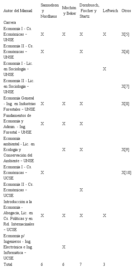 En una primera instancia se hace foco en la bibliografía escogida en cada espacio curricular, resumiendo los resultados obtenidos en la tabla n.° 2. Con excepción de la asignatura “Economía II” de la Lic. en Sociología de la UNSE, resulta unánime la centralidad de los manuales de economía para los procesos de enseñanza-aprendizaje. Se repiten los mismos autores (generalmente estadounidenses) dentro de las once asignaturas, tanto los manuales de Samuelson y Nordhaus (2010) como los de de Mochón y Beker (2008) aparecen seis veces. Por otro lado, los de Dornbusch, Fischer y Startz (2015) cuentan con siete apariciones, mientras que el de Leftwich (1987) posee tres. Estos manuales se complementan con otros según el espacio curricular, pero siempre dentro de los que Ruiz Villaverde (2016) denomina “manuales convencionales”, los cuales poseen contenidos que se reiteran y una estructuración en tres bloques: introducción a la economía, microeconomía y macroeconomía[3]. Esto último se observa en Samuelson y Nordhaus (2010) y en Mochón y Beker (2008). En otros casos, como los de Leftwich (1987) o Dornbusch, Fischer y Startz (2015), manuales de micro y macroeconomia, respectivamente, los textos se especializan en una de estas dos “ramas”, la desarrollan con mayor profundidad y excluyen los contenidos de la otra.