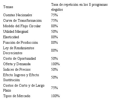 Concretamente, por un lado, se mostró que dentro de las once asignaturas analizadas se reiteran los mismos autores (generalmente estadounidenses), tanto los manuales de Samuelson y Nordhaus (2010) como los de de Mochón y Beker (2008) aparecen seis veces. Además, los de Dornbusch, Fischer y Startz (2015) cuentan con siete apariciones, mientras que el de Leftwich (1987) posee tres. Por otro lado, se tomaron trece temas fundamentales del programa de una de las asignaturas, para luego comparar si se repiten o no en las demás. Así, se exhibió que todos los temas figuran al menos en la mitad de los programas. Asimismo, nueve de trece temas aparecen en tres de cada cuatro programaciones. Por último, la mayoría de las temáticas (Modelo del Flujo Circular; Elasticidad; Función de Producción; Ley de Rendimientos Decrecientes; Oferta y Demanda; Costos de Corto y de Largo Plazo; y Tipos de Mercado) poseen una frecuencia de 88% o más.