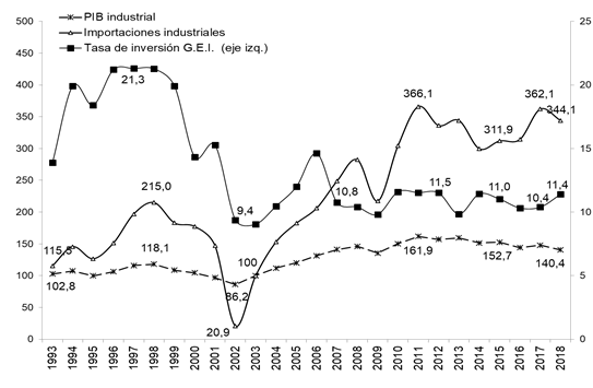 Fuente: elaboración propia en base a INDEC.Cabe señalar que los factores que explicaron el estancamiento del producto y de la actividad industrial durante la última fase kirchnerista (2012-2015) son aún materia de debate. Algunos autores ponen el énfasis en el proceso inflacionario y la consiguiente apreciación del tipo de cambio real, el impacto de la crisis brasilera y la implementación de controles a las importaciones y a la venta de divisas (véase, por ejemplo, Broda, 2015; Gerchunoff y Llach, 2018; Levy Yeyati y Castro, 2012). Por otro lado, existen otras líneas de investigación que, si bien consideran algunos de los factores previamente señalados, apuntan como causa principal a la ausencia de políticas industriales coordinadas y dirigidas que promovieran un cambio en la estructura productiva (Abeles y Amar, 2017; Kulfas, 2016; Castells y Schorr, 2015; Manzanelli y Basualdo, 2017; Lavarello y Sarabia, 2015; Porta, Santarcángelo y Schteingart, 2014; Schorr y Wainer, 2017; entre otros).