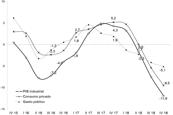 Así, desde la visión oficial, las recetas para resolver los desequilibrios económicos no residían en políticas que tiendan a diversificar la matriz industrial y reorientar el excedente a la inversión, sino en la reducción de los salarios reales, el recorte del gasto público y la elevación de la tasa de interés. De allí que la política económica deterioró los dos componentes de la demanda que dinamizaban al producto bruto industrial: el consumo privado y el gasto público. Tal como puede constatarse en el gráfico 2, la evolución del valor agregado industrial tuvo una estrecha correspondencia con ambos indicadores, especialmente con el consumo privado, durante el período 2015-2018.