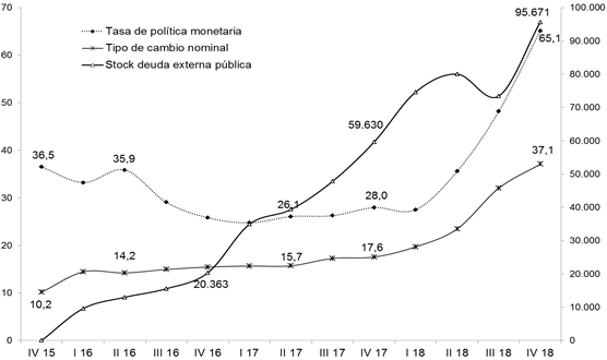 Se inició, de esta manera, un nuevo ciclo de endeudamiento externo que es la resultante de dos procesos convergentes: las inversiones de cartera de extranjeros en el marco de la “bicicleta financiera” y las crecientes necesidades de divisas del gobierno en virtud, por un lado, de la ampliación del déficit de cuenta corriente de la balanza de pagos que alcanzó, en el marco de la apertura comercial, al 5% del PIB en 2017 y 2018 (CIFRA, 2019) y, por el otro, de la elevada y permanente fuga de capitales al exterior que tuvo su epicentro en la corrida cambiaria en abril de 2018. Asimismo, el acuerdo con el FMI derivó en la implementación de una política monetaria de fuerte sesgo ortodoxo (congelamiento base monetaria y 65,1% de tasa de interés promedio en el último trimestre de 2018).