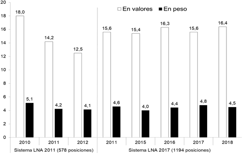 Al respecto, vale señalar que el incremento de 578 posiciones sujetas a LNA en 2011 a 1.194 posiciones en 2018 no supone una mayor cobertura ya que la incidencia de las 1.194 posiciones en las importaciones del país es más limitada que las 578 de 2011. Es decir, el actual esquema contempla mayor cantidad de posiciones que no tienen una participación significativa en las compras externas. Asimismo, la tendencia evidencia que el aumento de posiciones no disminuyó la gravitación de esos productos en las importaciones totales como sí se había constatado con el sistema vigente en forma previa a 2012.