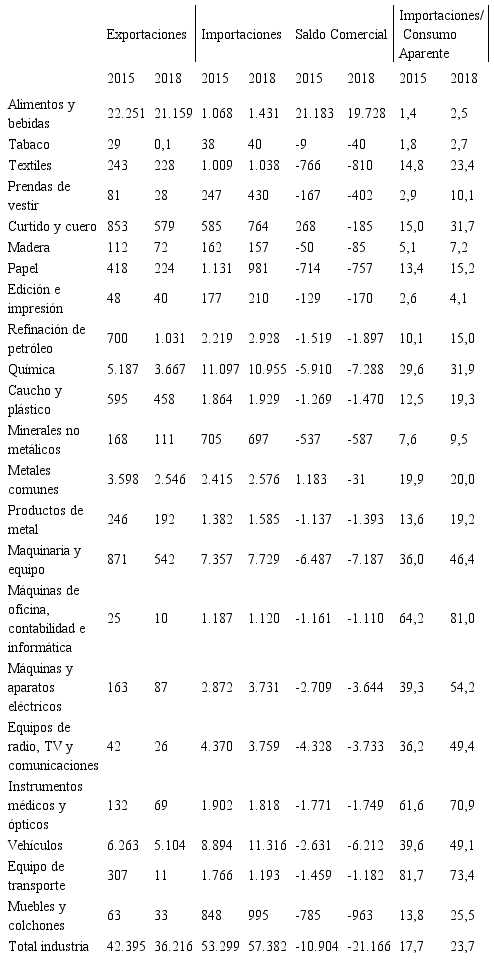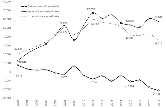 De resultas de la apertura importadora se asistió a un incremento del 7,7% de las importaciones en dólares corrientes de productos industriales entre 2015 y 2018. Tal desempeño de las compras externas, junto a la importante disminución de las exportaciones fabriles, implicó una duplicación del déficit comercial del sector, que pasó de 10.904 millones de dólares en 2015 a 21.166 millones de dólares en 2018.
