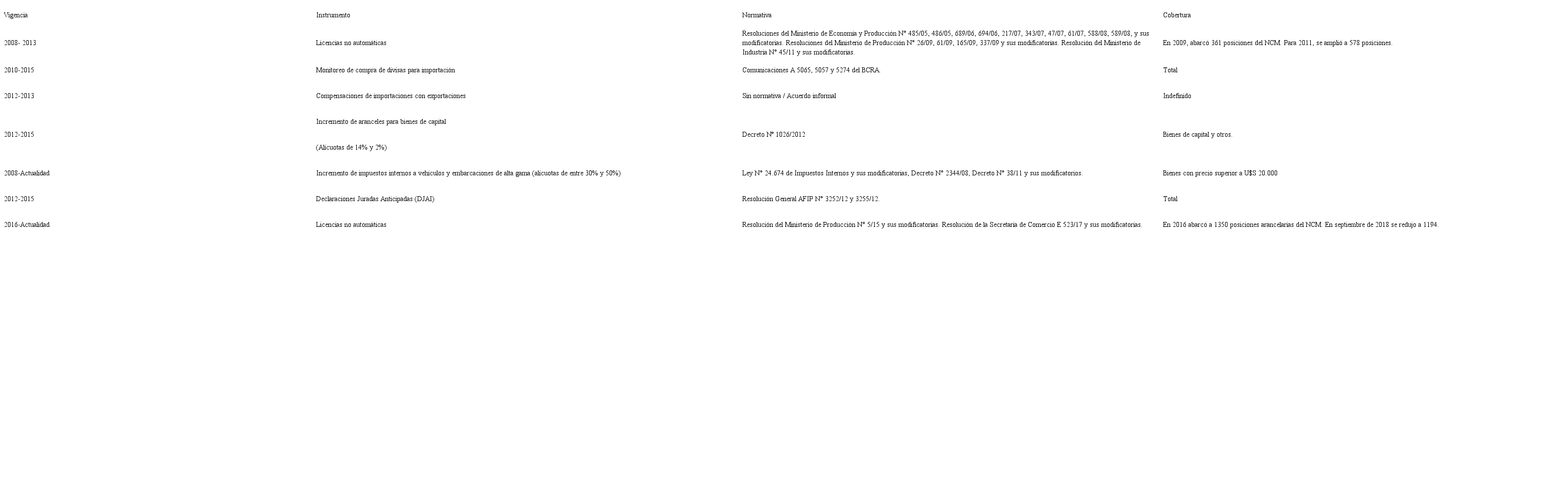 Con tal finalidad, y antes de adentrarse en el análisis específico de las modificaciones impulsadas por la alianza Cambiemos, resulta necesario pasar revista a la situación previa, ciertamente contrastante en materia de regulación de las compras del exterior. Cabe señalar con respecto a ellas que, si bien disminuyeron el flujo importador, no existe evidencia que indique que estas fueron realizadas en el marco de una política industrial. Las mismas comenzaron con el objeto de atender los efectos perniciosos de la crisis de 2008 e incrementaron su importancia a partir de la emergencia de la restricción externa. En el cuadro 1 se resumen las más relevantes.