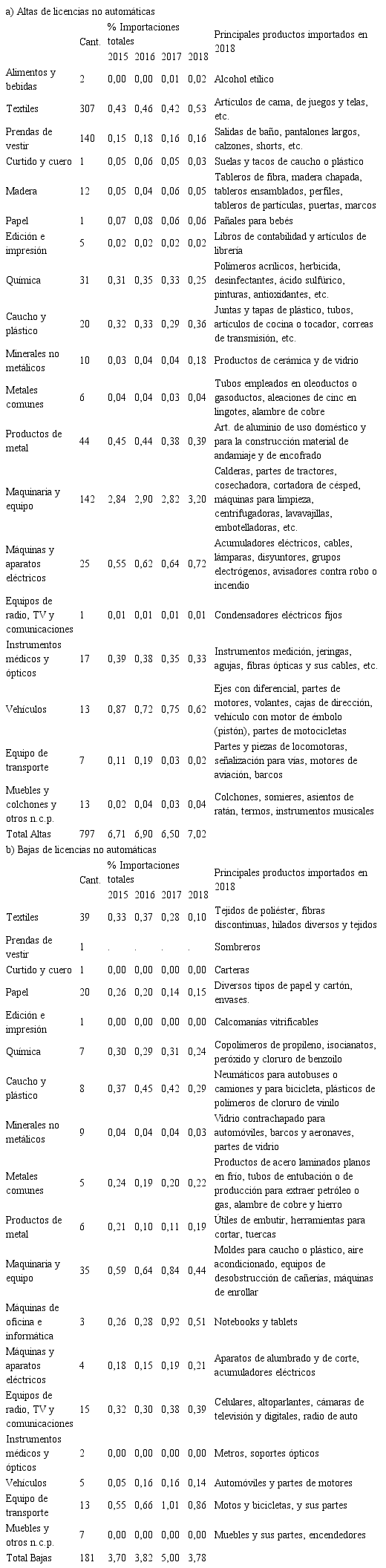Un caso especial que también se integra en este segmento de “perdedores” es el de la industria de metales comunes ya que las 6 incorporaciones de licencias no automáticas tienen una participación reducida e invariante (0,04% en 2018) en tanto que las 5 licencias eliminadas son de bienes de mayor importancia (0,22% en 2018). Se trata, principalmente, de los productos de acero laminados en frío y tubos de entubación o producción para la industria petrolera. Ambos productos de suma relevancia para el Grupo Techint que es monopólico en esos mercados a través de Siderar y Siderca, respectivamente.