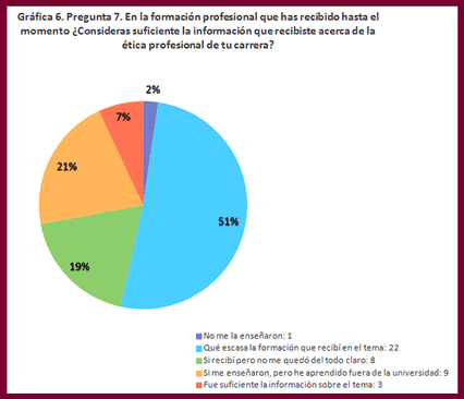 Las respuestas a la pregunta anterior, refleja que la enseñanza en ética profesional recibida en las aulas no es suficiente, dado que en su mayoría el estudiante la considera escasa en un 51%. En un segundo término 21% los estudiantes refieren que en materia de ética además de la universidad, aprendieron también fuera de la misma; además de que un sector importante refiere que la información recibida no quedó del todo clara 19%.