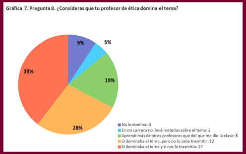 La pregunta (siguiente Gráfica 7), respecto al dominio de la materia por parte del profesor, se le cuestionó al participante de la forma siguiente: 8. ¿Consideras que tiene el profesor sobre el tema de ética. Las respuestas reflejaron, lo siguiente: