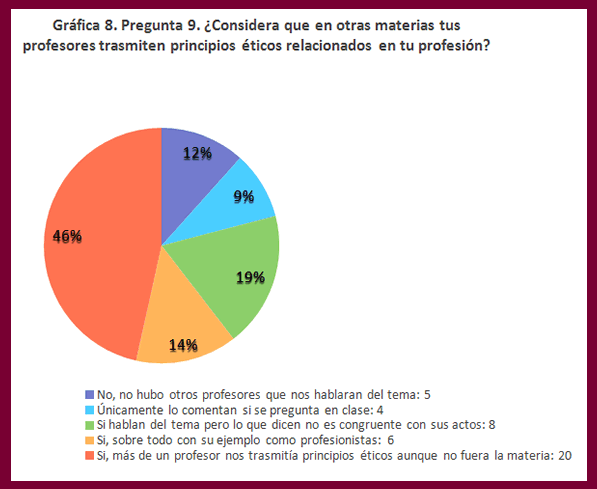 En la siguiente pregunta se inquiere sobre si los profesores reflejan o trasmiten principios éticos; esto es, con independencia de que no sea la materia que se les imparte. En el gráfico siguiente Gráfica 8, se preguntó: 9. ¿Considera que en otras materias tus profesores trasmiten principios éticos relacionado en tu profesión? Las respuestas fueron las siguientes: en prácticamente la mitad de la muestra (47%) los estudiantes manifiestan que el profesor trasmite principios éticos, aunque no sea objeto de su materia. Ello es alentador, porque implica que por una parte del profesorado existe cierto compromiso y convicción ética en la forma de conducirse en la profesión de Abogado.
