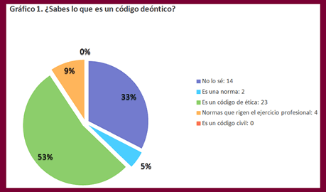 En el siguiente Gráfico 1. Se observan las respuestas que dieron los participantes sobre el conocimiento sobre el código deontológico. Se puede apreciar que la mayoría de los encuestados conocen la respuesta.