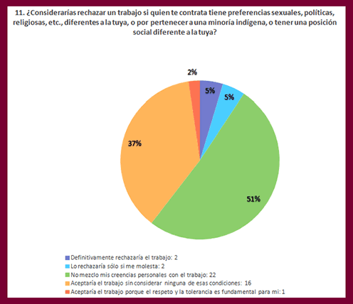 La siguiente gráfica 11. Muestra las respuestas de los participantes a una pregunta sobre tolerancia respecto a las minorías. Se preguntó de la forma siguiente: Pregunta12. ¿Considerarías rechazar un trabajo si quien te contrata tiene preferencias sexuales, políticas, religiosas, etc., diferentes a la tuya, o por pertenecer a una minoría indígena, o tener una posición social diferente a la tuya?