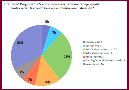 Las respuestas a esta pregunta, llamativamente el participante elige el no responder con un 14%. La pregunta qué clara y no genera confusión el sentido de la misma. Por lo que se colige que eligió guardar silencio y darnos una no respuesta. Le sigue la respuesta de rechazar un trabajo por satisfacción profesional en un 28%, ello es por preferir alguna oferta que fuese de su mayor preferencia o interés. Sigue con un 14% el interés personal. Implica entonces estas dos últimas respuestas anteriores que el participante tiene altas expectativas personales y profesionales de su actividad con un 42%. Muy por detrás encontramos un empate del 7% tres respuestas que tienen que ver con corrupción, acoso laboral, o la actitud de no rechazar un trabajo bajo ningún motivo. Por último, con un 5% refiere que serían motivos económicos. En todo caso, estás últimas respuestas no son tan significativas.