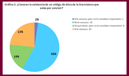 Respecto a la pregunta que se encuentra en el Gráfico 2. Que refiere pregunta 2. ¿Conoces de la existencia del código de ética de la licenciatura que estas por concluir? las respuestas se correlaciona con la pregunta anterior.