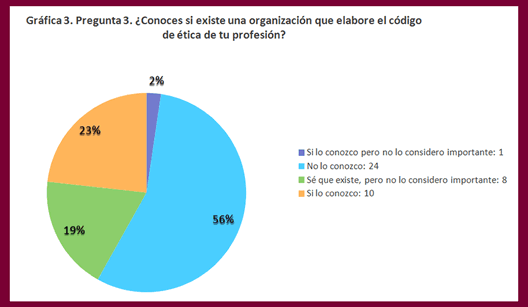 En la siguiente Gráfica 3. De la Pregunta 3. Se pregunta a los estudiantes sobre si conocen que organización elabora el código de ética de su futura profesión.