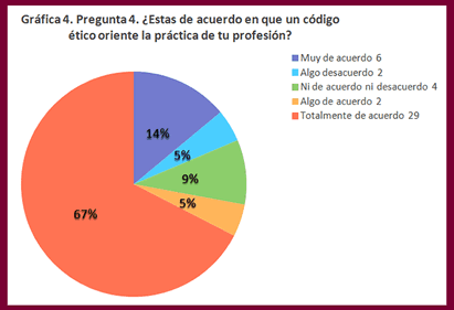 En el siguiente gráfico se muestran los resultados de la pregunta 4. ¿Estás de acuerdo en que un código ético oriente la práctica de tu profesión? Estas respuestas son interesantes, aunque contradictorias, si se vincula las respuestas de que aparece en la gráfica anterior, en la que nos mostraba el desinterés en conocer que organización elabora el código de ética de su profesión. Muestra la gráfica que en su mayoría los participantes refieren que están totalmente de acuerdo (67%), más el 14% que está muy de acuerdo, suman el 81% del total de las respuestas. Sin embargo, como se advierte en preguntas anteriores no conocen el código ético, ni la organización que lo establece.