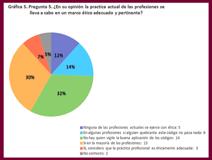 La siguiente Gráfica 5 muestra la percepción sobre la ética en la práctica profesional de las profesiones en general; se pregunta ¿En su opinión la practica actual de las profesiones se lleva a cabo en un marco ético adecuado y pertinente?