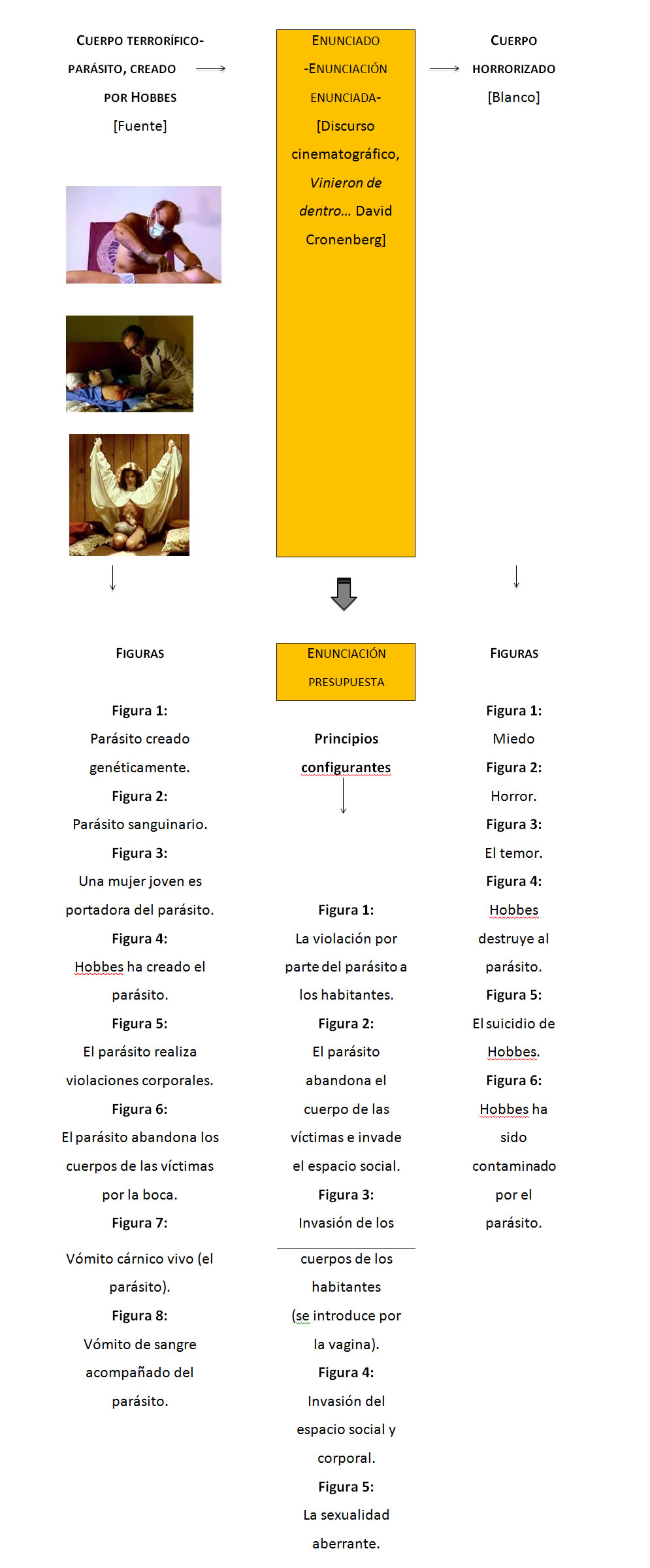Los cuerpos corporales deformes, lo monstruoso y la confrontación con lo sobre natural causa terror, no solo Nosferatu, o el hombre lobo, sino también las actividades humanas consideradas obscenas, impulsivas y aberrantes. Aún más, lo horrífico también está implicado en lo creado por el hombre al traspasar el umbral de lo prohibido. De tal manera que el ser horrendo ya no es solo una sombra o un fantasma, sino aquellos cuerpos horríficos extraños que invaden el cuerpo de los demás con la finalidad de perpetuar su vida, aunque destruyan la vida humana. Así sucede cuando los habitantes de las Torres Starliner se enfrentan a un parásito que violenta los cuerpos. Se trata, sin lugar a dudas, de la narración expuesta en Vinieron de dentro… (1975) de David Cronenberg, obsérvese la sintaxis discursiva figurativa: