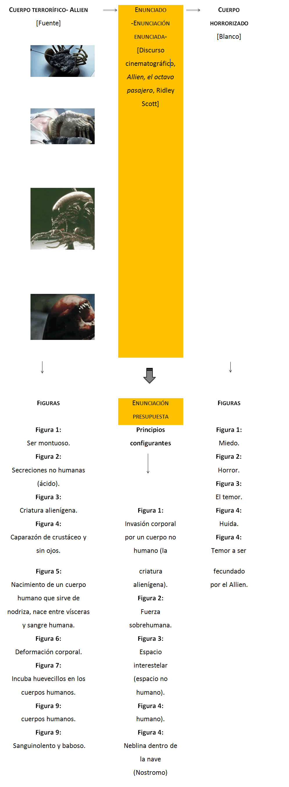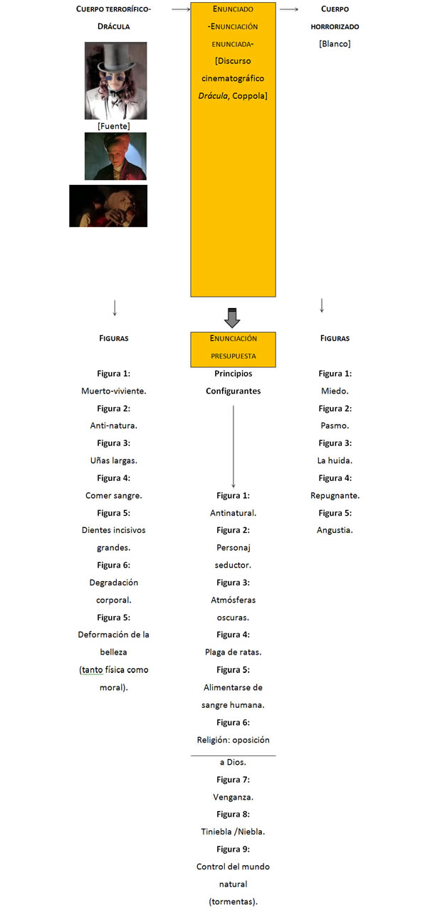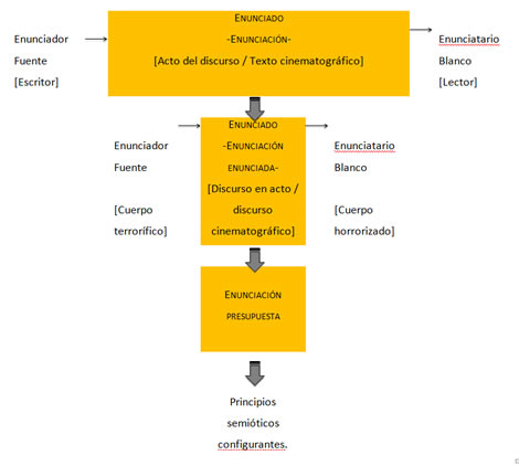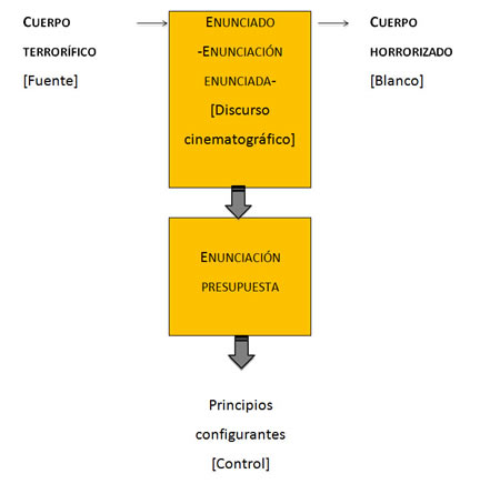 El cine de horror pone a prueba la egológica de la enunciación, pues los enunciadores no son individuos lingüísticos, sino presencias sensibles, por tanto, la enunciación centralizada en el sujeto queda rebasada. De tal manera, los sujetos dejan de ser meras «predicaciones» para transformase en personas percibientes y sentientes. En tal sentido, las «posiciones enunciativas» son abandonadas constantemente y lo que un momento fungió como enunciador, después será enunciatario o, en última instancia, un él que funciona como filtro, norma o principio de las significaciones discursivas, incluso, podría asumir la posición enunciadora. Como no son individuos lingüísticos, la sintaxis será la de una figuración donde los praxemas, los patemas e incluso los corporemas aproximan a la Semiótica a la significación corporal, por tanto, a los dispositivos semióticos del cuerpo terrorífico. Es por ello que la sintaxis discursiva figurativa del cuerpo terrífico se fundamenta en la enunciación enunciada y en la enunciación presupuesta, para ello baste el siguiente modelo de operación semiótica: