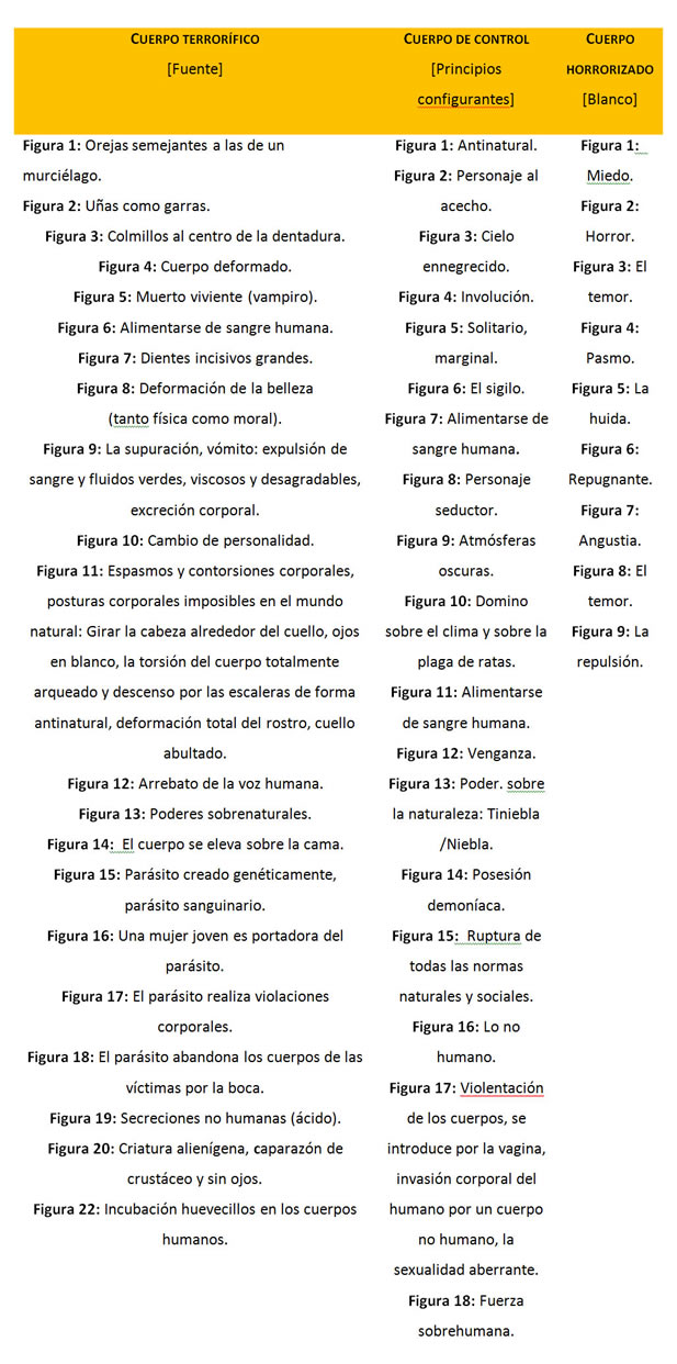 Es evidente que el horror implicaría muchas otras figuras, la cuales están relacionadas con el pavor, la incomodidad, la repugnancia, además de las ya mencionadas. Incluso en los principios configurantes también inciden núcleos semánticos como la anormalidad; los personajes de naturaleza maligna como los criminales; lo sobrenatural como en el caso de los vampiros o lo repugnante que resulta de alimentarse de sangre humana. No obstante, lo que interesa es delimitar las figuras discursivas del cuerpo horrífico.
