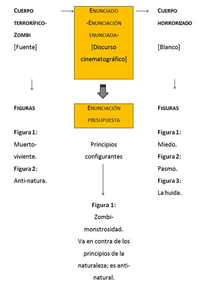 La configuración corresponde, entonces a un personaje cinematográfico perseguido por el monstruo-zombi, lo cual le provoca horror, pues existe una ruptura del umbral natural-anti-natural. La proyección, llega al espectador y se debe a que el cine de horror desplaza la significación hacia las personas sintientes y percibientes presentes en la sala cinematográfica. La sintaxis discursiva figurativa ofrece, por un lado, la presencia del nacimiento de un ser degradado -cuerpo horrífico, zombi- y la del cuerpo horrorizado. En tal sentido, la figura «no viviente-viviente» resulta de la red figurativa fundada por las relaciones entre el cuerpo terrorífico -fuente-, el cuerpo horrorizado -blanco- y el cuerpo de control -normas-. Los datos nos permiten delimitar la dimensión figurativa del cine de horror.