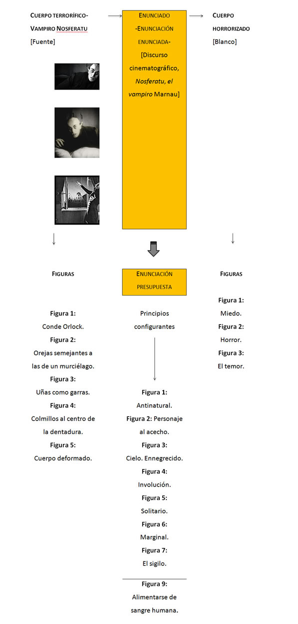 La monstruosidad figurada rompe los límites históricos y culturales de los cuerpos que, al ser corrompidos, ya sea física o moralmente, son sede y vector del miedo al ser considerados horrísonos. Todo cuerpo considerado inmoral, en putrefacción, productor de excreciones, decadente o perverso, resulta terrorífico. Estos elementos son el último estadio de la figurativización del discurso. Entonces, la figuración expone los indicios que vierten a las figuras el valor generador de la imagen referencial. ¿Esquema cognitivo? Sí, pero también indicio de lo configurante. Si pensamos en la historia del cine, seguramente el primer ser monstruoso que aparece es Nosferatu, el vampiro (1922) de Friedrich Wilhelm Plumpe -Marnau-, fundador del cine de horror alemán. Veamos la sintaxis discursiva figurativa de este personaje horrendo: